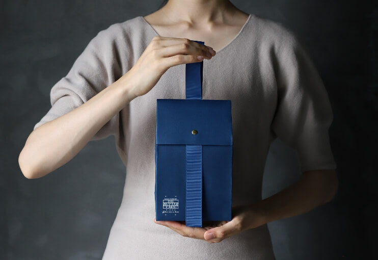 大切な方へ渡すギフトは、見た目も美しく整えて真心を表したい。THE BUTTER CAKEのギフトバッグは、個箱が縦に3つ入る丁度よいサイズ。厚手のリボンを金色の金具で留めた、華やかさのある仕様です。深い青色の袋がパッケージのシンプルな色味を引き立てます。