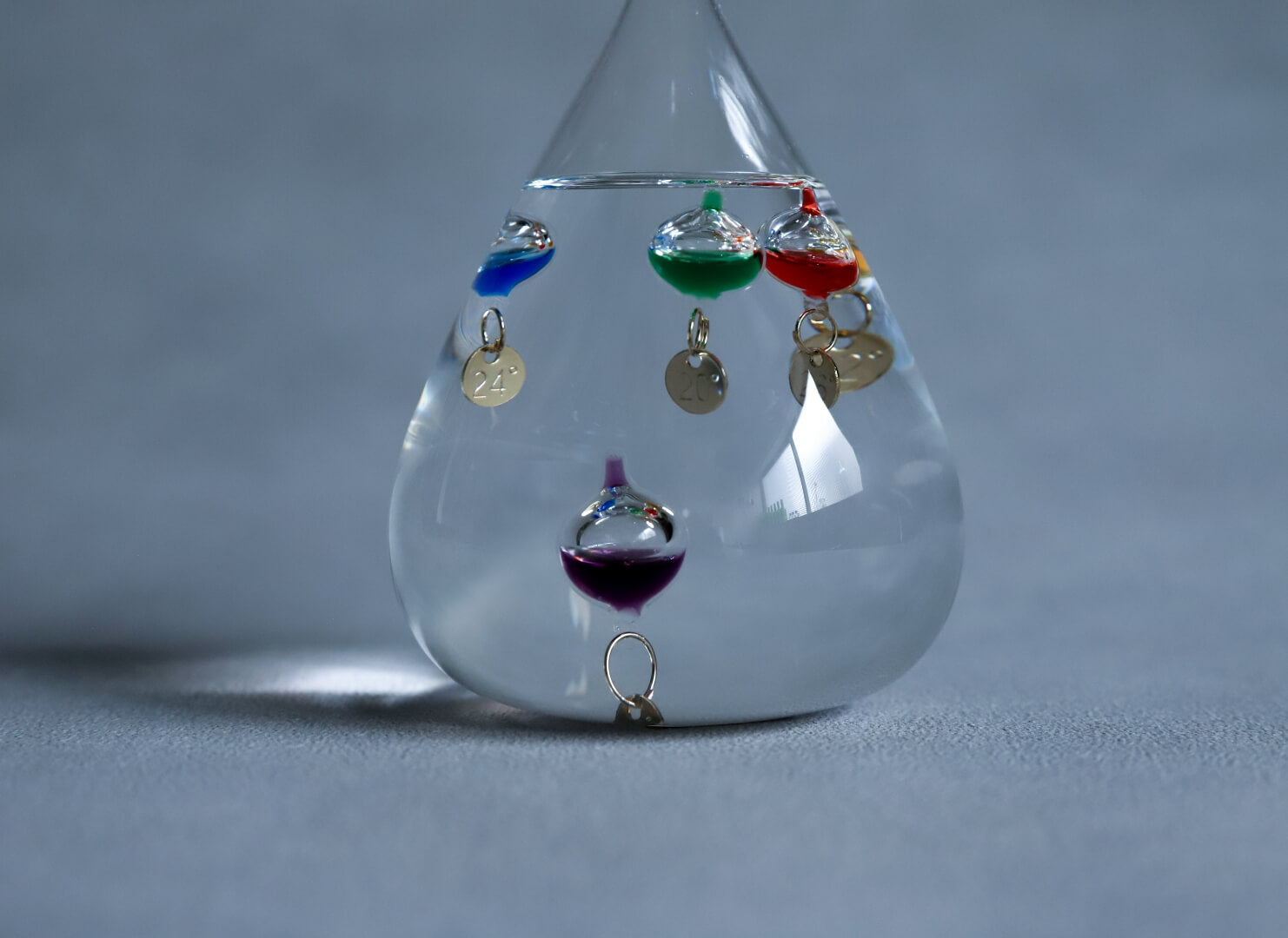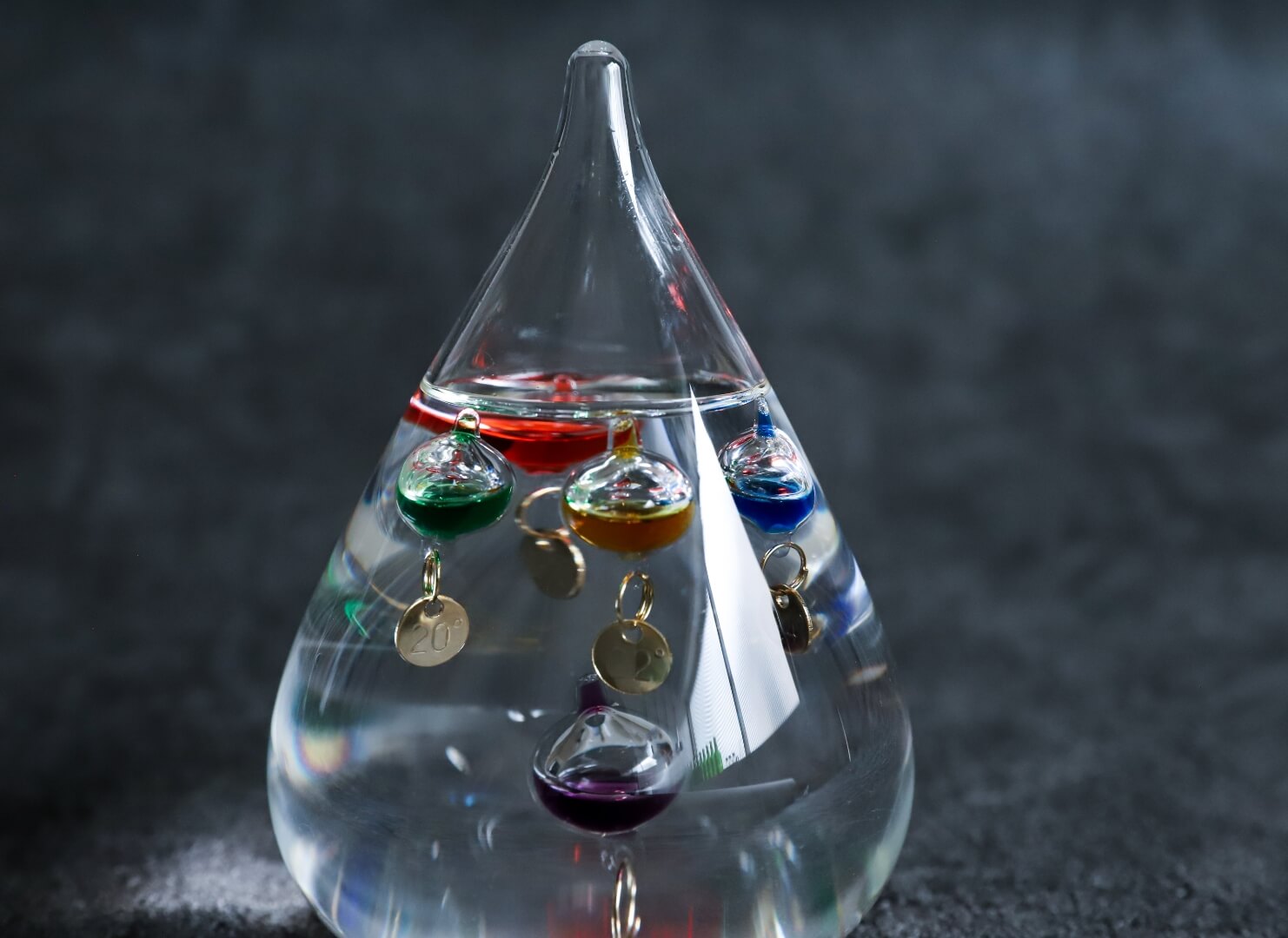 カラフルで密度の異なる液体が入ったガラス球に、一色ずつ違う気温の書かれたプレートが下がっている。