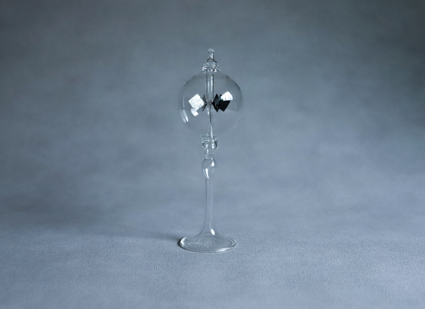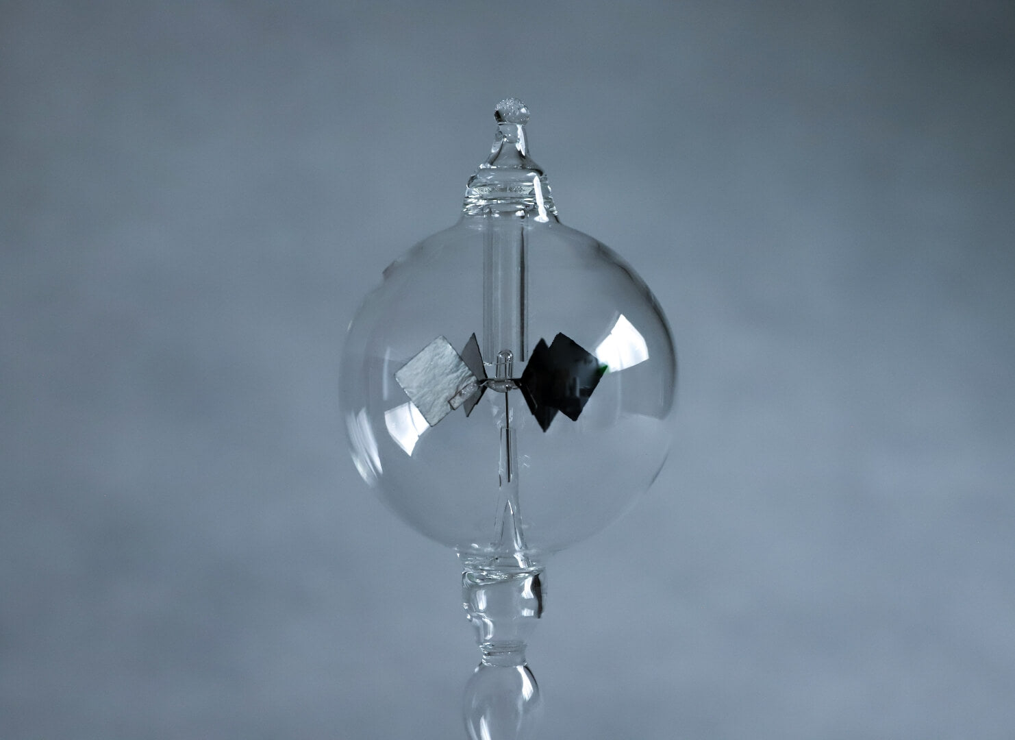 光で回転する不思議なオブジェ「ラジオメーター」。光熱に照らされると、ガラス内の4枚の羽根が回転します。