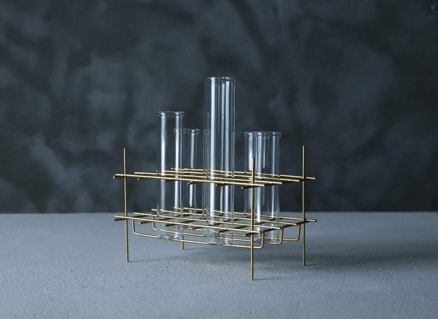 置く場所や照明、更にガラスチューブを入れ替えることで見え方が変わる花器は、花の魅力を千度語る。